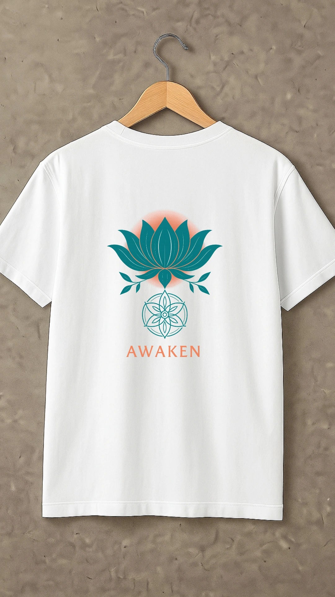 Grounded by a sacred geometric mandala and topped off with the word “AWAKEN” in bold, serene lettering, this design invites presence, purpose, and transformation. More than a t-shirt, it's a wearable mantra — perfect for those who walk the line between mindfulness and modern aesthetics.
