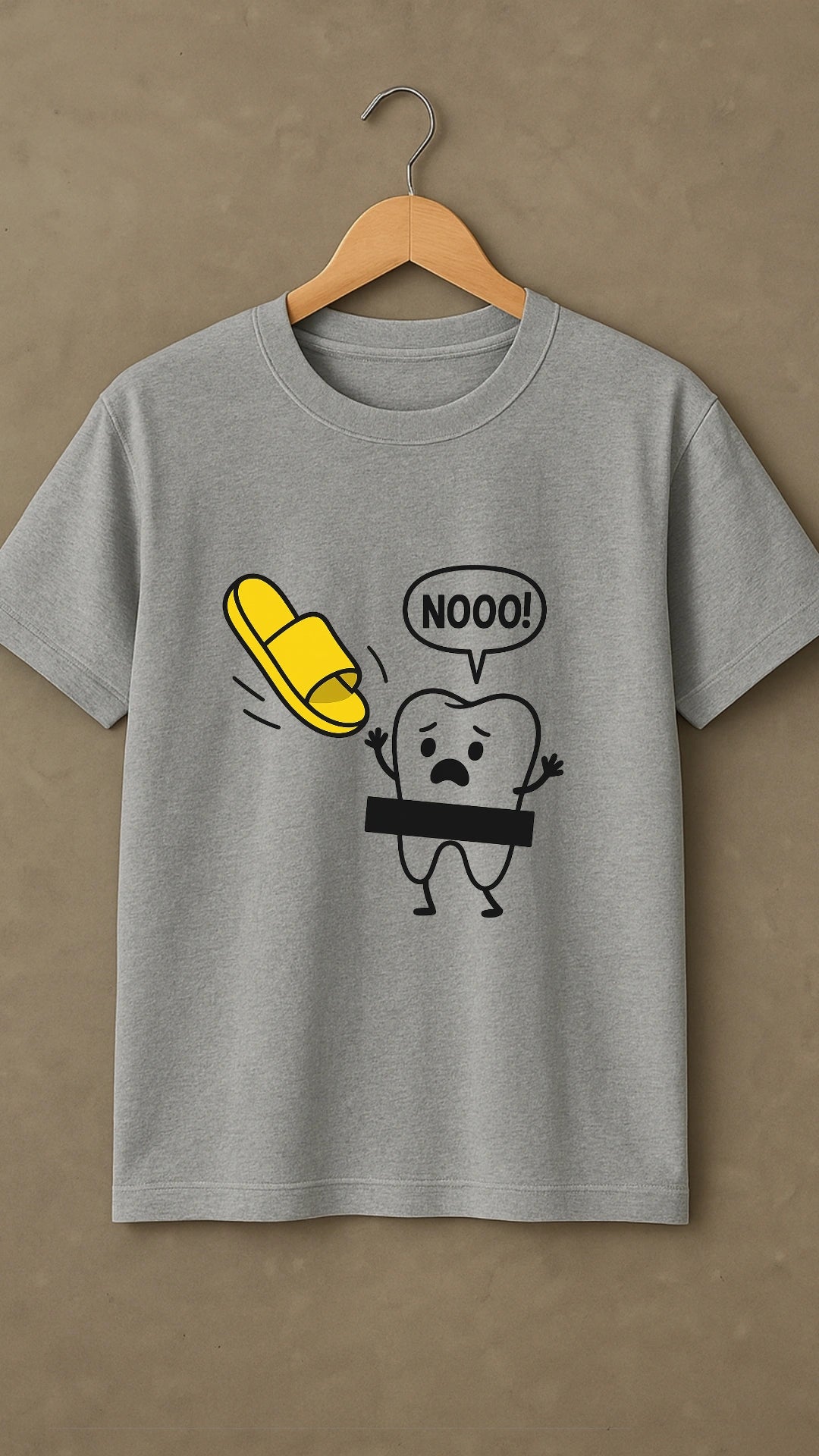 This hilariously expressive tee features a wide-eyed, terrified cartoon tooth, mid-freakout, screaming “NOOO!” as a bright yellow chappal flies toward it. The dramatic pose, the oversized slipper, and the iconic desi reference make this design an instant conversation starter.